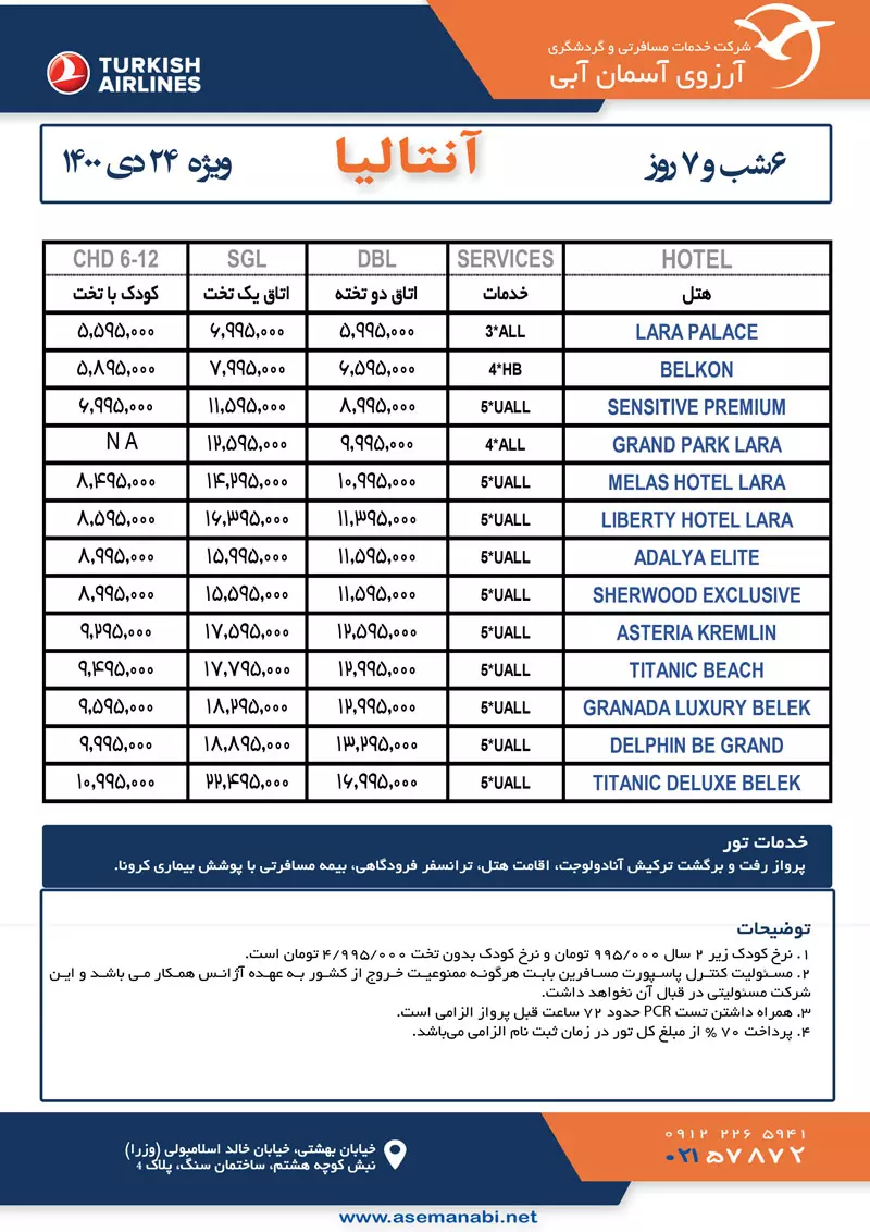 تور آنتالیا | ویژه 24 دی ماه 1400 | پرواز ترکیش ایرلاین