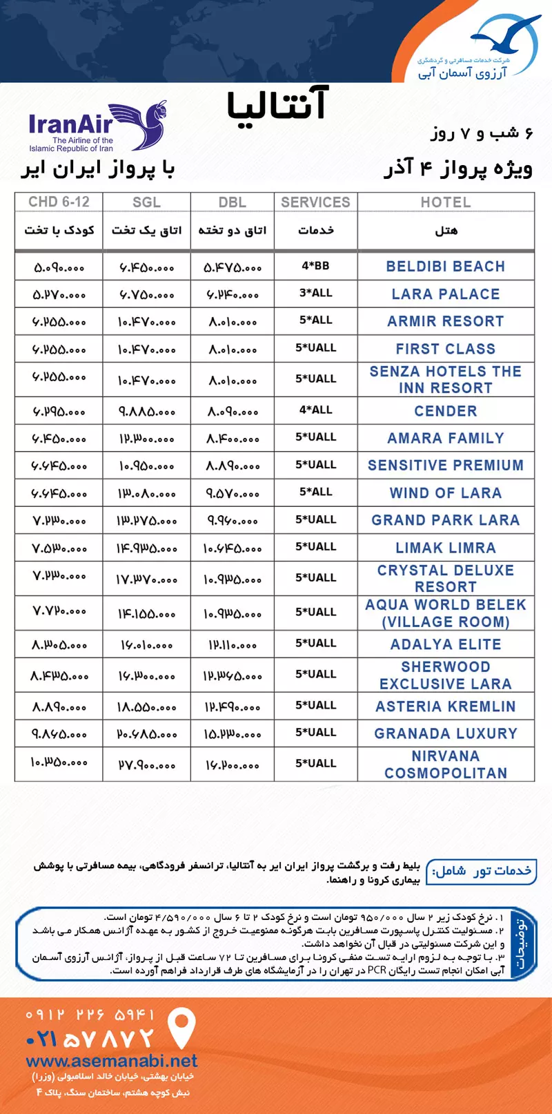 تور آنتالیا | ویژه 4 آذر | پرواز ایران ایر