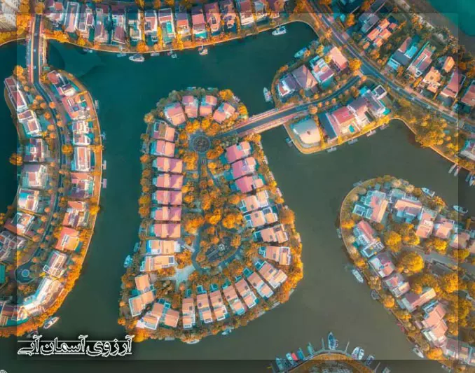 مجموعه ای از خانه های مسکونی که در ساحل شهر جزیره ای در جنوب شرقی آسیا شکلی از امواج دریا را ایجاد کرده اند.