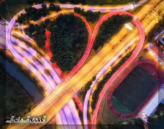 تقاطع شاهراهی که با نورپردازی ها و معماری ویژه خود شکل قلب مانندی به خود گرفته است و تفسیری رمانتیک از این عکس می دهد.