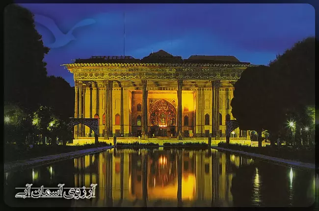 کاخ چهل ستون یکی از آثار تاریخی متعلق به دوران صفوی است که مبارک ترین بنای دنیا را دارد. معماری این باغ تلفیقی از هنر و معماری چینی، ایرانی و فرنگی است. ساختمان چهل ستون دارای یک ایوان است که یک بخش ان بر روی 18 ستون چوبی قرار گرفته و چهار ستون وسط آن بر روی 4 شیر سنگی قرار دارد.