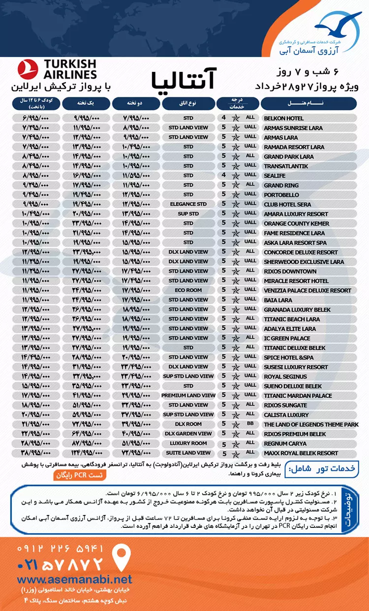 تور آنتالیا | ویژه 27 و 28خرداد | پرواز ترکیش ایرلاین