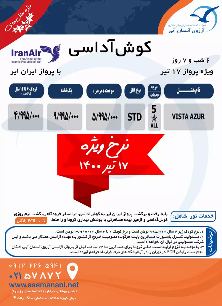 تور کوش آداسی | ویژه 17 تیر | پرواز ایران ایر