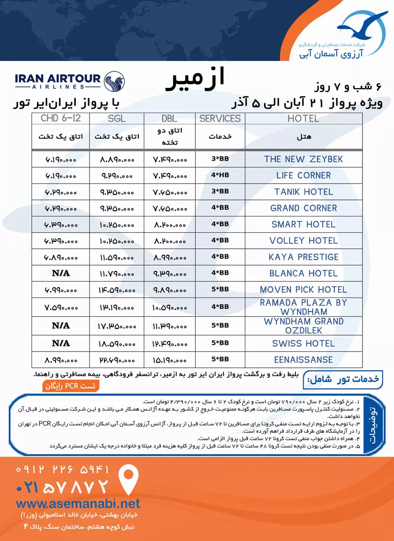 تور ازمیر | ویژه 21 آبان الی 5 آذر | پرواز ایران ایر تور