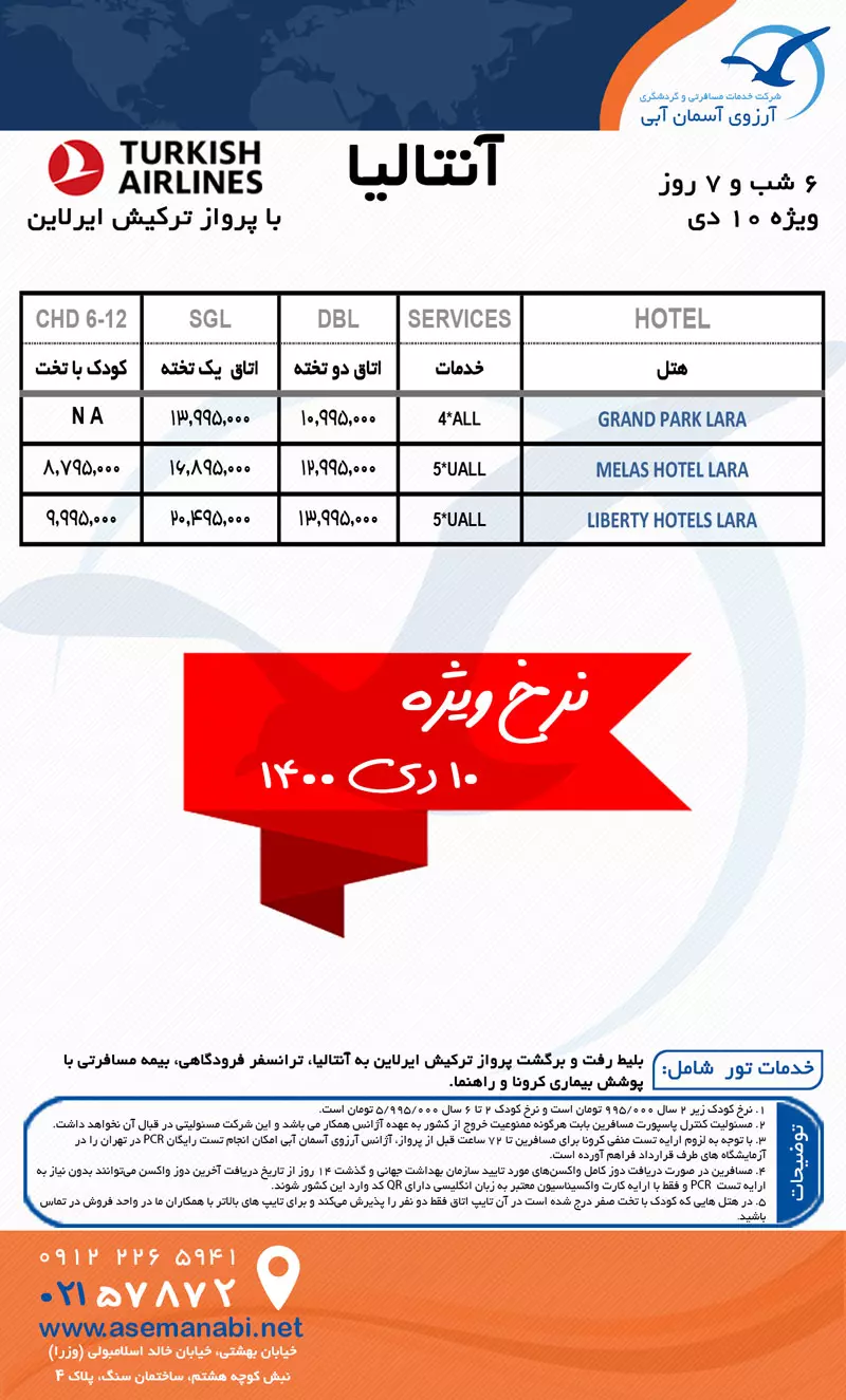 تور آنتالیا | 7 روز ویژه 10 دی | پرواز ترکیش ایرلاین